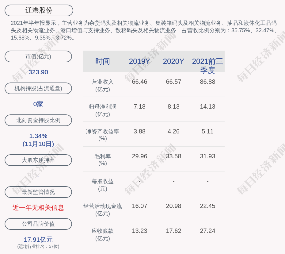 2021年半年报显示,辽港股份的主营业务为杂货码头及相关物流业务、集装箱码头及相关物流业务、油品和液体化工品码头及相关物流业务、港口增值与支持业务、散粮码头及相关物流业务,占营收比例分别为:35.75%、32.47%、15.68%、9.35%、3.72%。