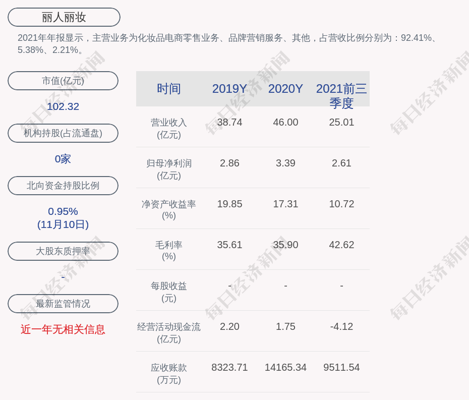 2021年年报显示,丽人丽妆的主营业务为化妆品电商零售业务、品牌营销服务、其他,占营收比例分别为:92.41%、5.38%、2.21%。