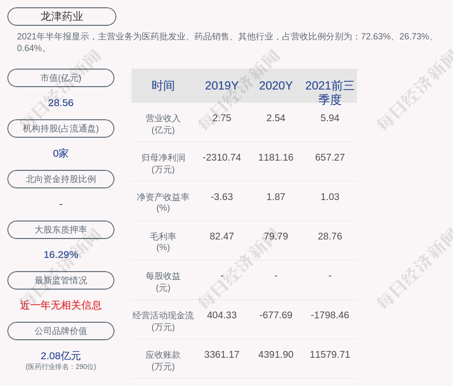 2021年半年报显示,龙津药业的主营业务为医药批发业、药品销售、其他行业,占营收比例分别为:72.63%、26.73%、0.64%。