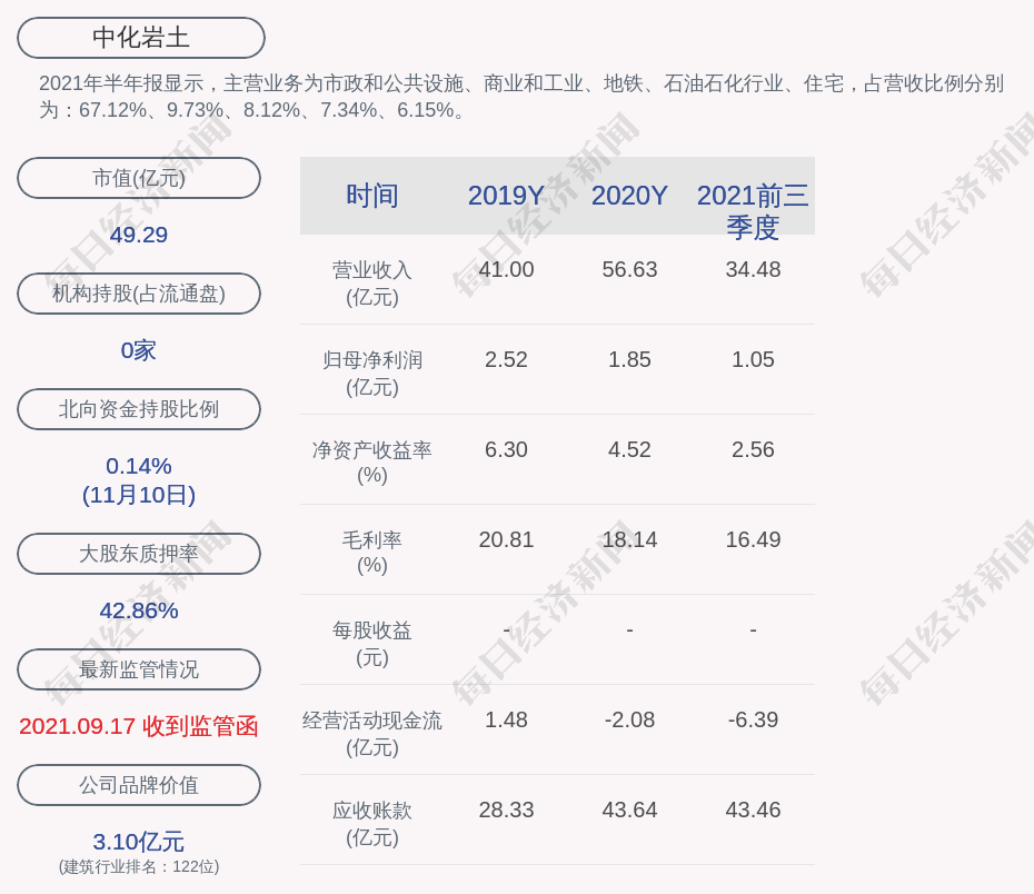 2021年半年报显示,中化岩土的主营业务为市政和公共设施、商业和工业、地铁、石油石化行业、住宅,占营收比例分别为:67.12%、9.73%、8.12%、7.34%、6.15%。