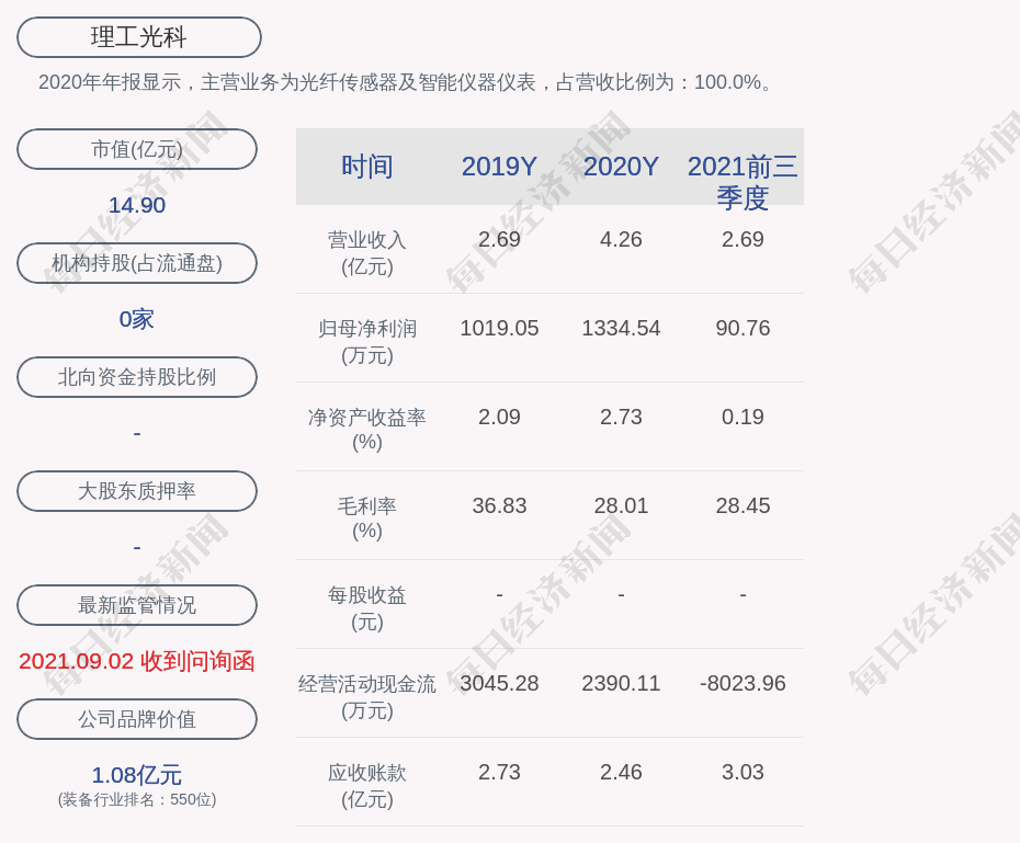 2020年年报显示,理工光科的主营业务为光纤传感器及智能仪器仪表,占营收比例为:100.0%。