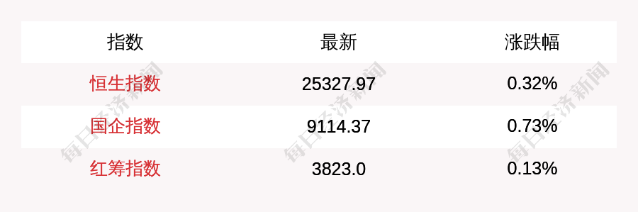 每经AI快讯:北京时间11月12日16:00,恒生指数收盘上涨79.98点,涨幅为0.32%,报收25327.97点;国企指数收盘上涨65.98点,涨幅为0.73%,报收9114.37点;红筹指数收盘上涨5.14点,涨幅为0.13%,报收3823.0点。南向资金当日净流出20.5亿元。