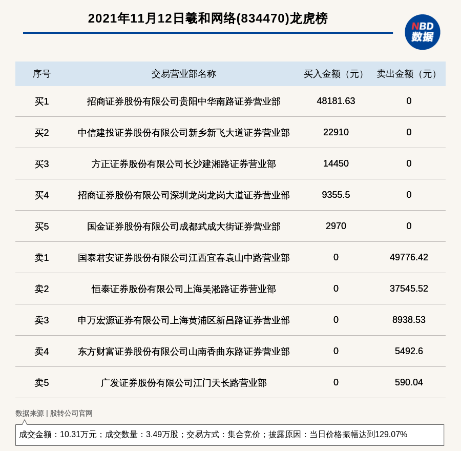 每经讯,2021年11月12日,羲和网络(834470)登上龙虎榜,交易方式是集合竞价,披露原因是当日价格振幅达到129.07%,成交数量3.49万股,成交金额10.31万元。买一席位为招商证券股份有限公司贵阳中华南路证券营业部,买入4.82万元;卖一席位为国泰君安证券股份有限公司江西宜春袁山中路营业部,卖出4.98万元。