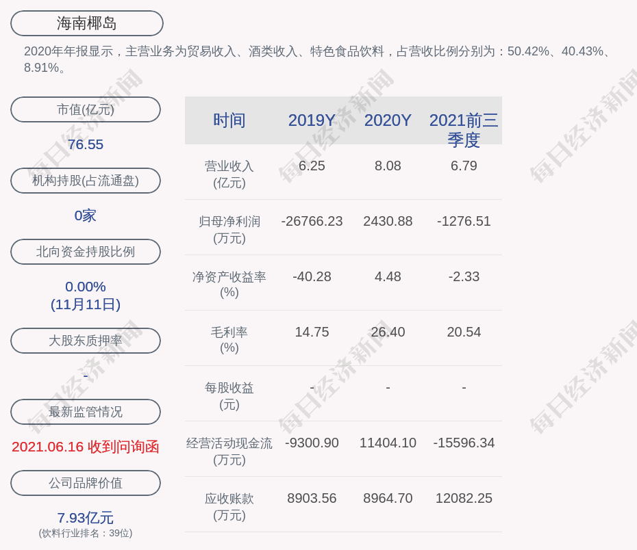 2020年年报显示,海南椰岛的主营业务为贸易收入、酒类收入、特色食品饮料,占营收比例分别为:50.42%、40.43%、8.91%。