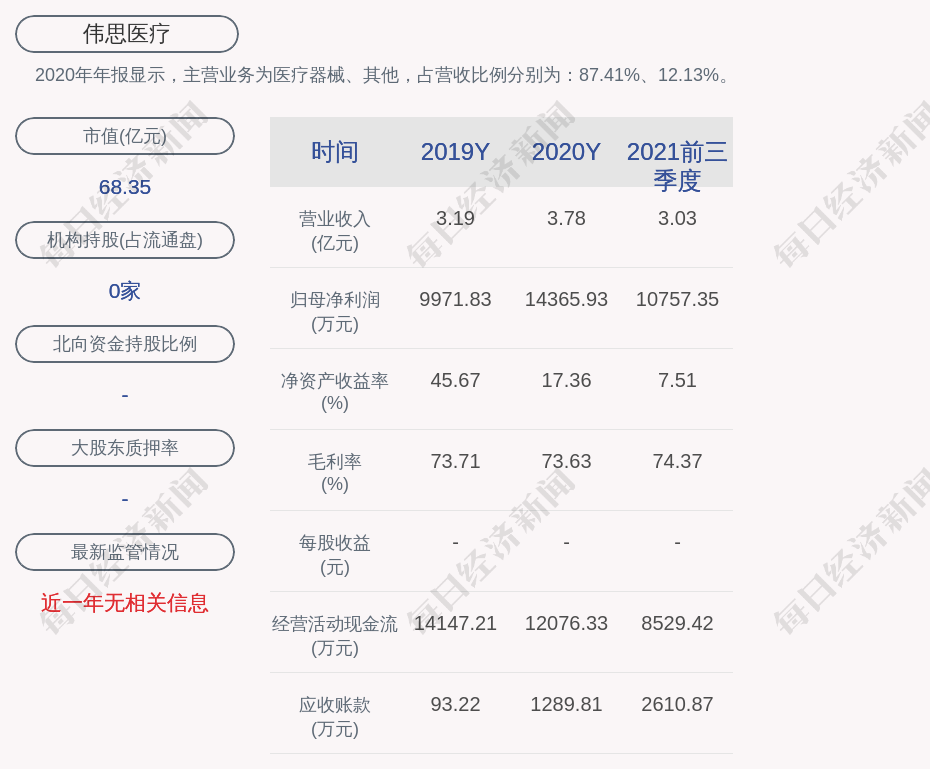 2020年年报显示,伟思医疗的主营业务为医疗器械、其他,占营收比例分别为:87.41%、12.13%。