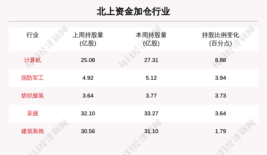 本周北上资金加仓的行业共有13个。其中,计算机行业加仓最明显,北上资金持股数环比增加8.88%。其他北上资金加仓较多的行业还包括国防军工、纺织服装、采掘。