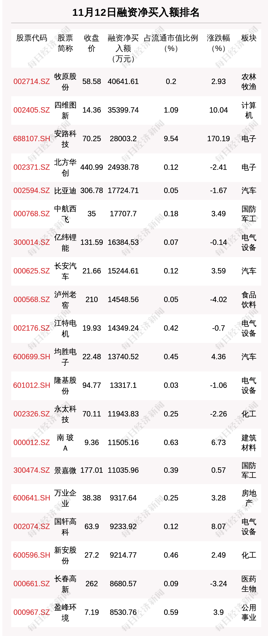 从融资资金净买入金额来看,共有15只个股净买入金额超亿元,其中牧原股份、四维图新、安路科技排名前三,买入金额分别为4.06亿元、3.54亿元、2.8亿元。