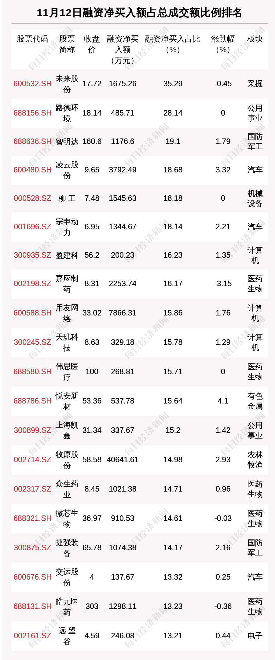 11月12日两市共有975只个股有融资资金净买入。共有59只股票融资净买入额占总成交金额比例超10%,其中未来股份、路德环境、智明达排名前三,占比分别为35.29%、28.14%、19.1%。