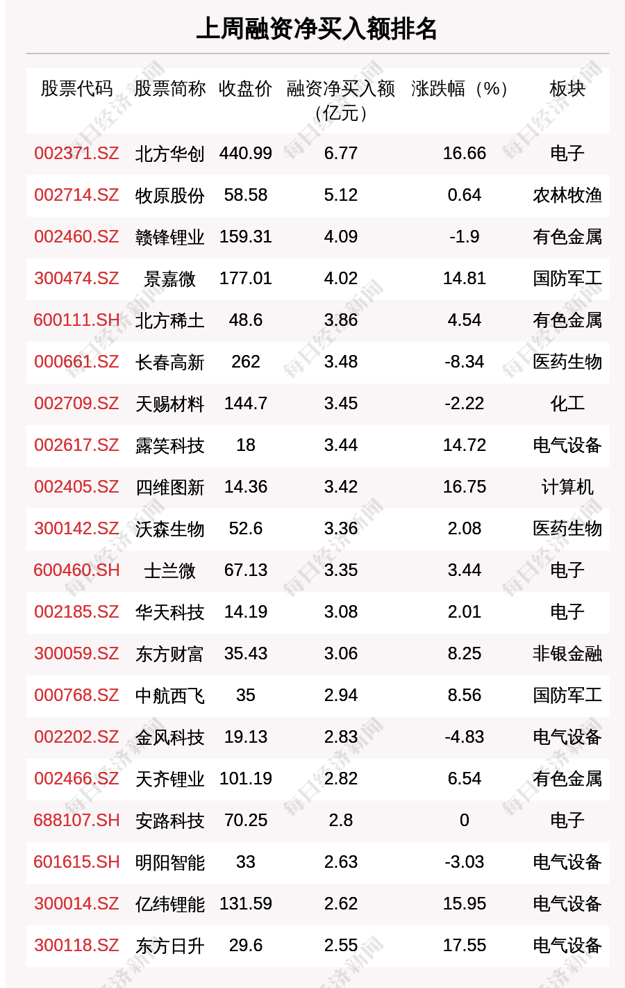 上周两市共有1112只个股有融资资金净买入,共有0只个股净买入金额超10亿元,其中北方华创、牧原股份、赣锋锂业排名前三,买入金额分别为6.77亿元、5.12亿元、4.09亿元。