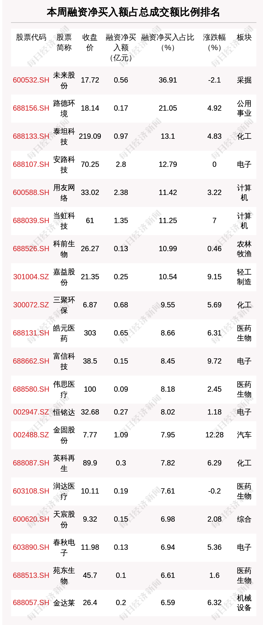 两市共有8只股票融资净买入额占总成交金额比例超10%,其中未来股份、路德环境、泰坦科技排名前三,占比分别为36.91%、21.05%、13.1%。