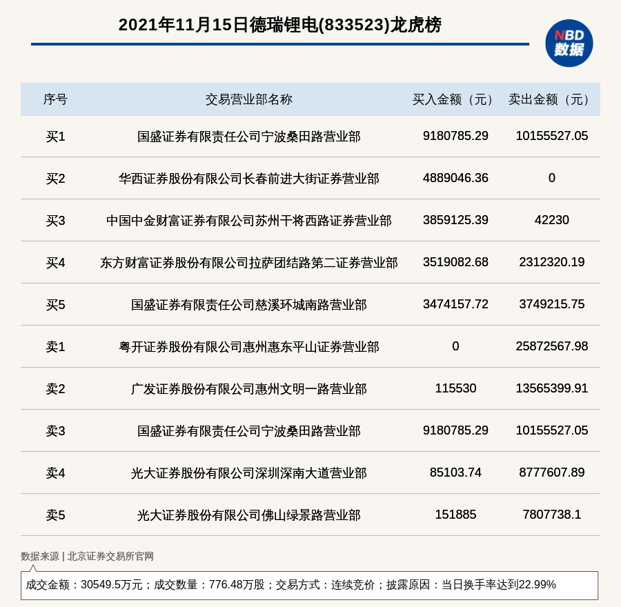 每经讯,2021年11月15日,德瑞锂电(833523)登上龙虎榜,交易方式是连续竞价,披露原因是当日换手率达到22.99%,成交数量776.48万股,成交金额30549.5万元。买一席位为国盛证券有限责任公司宁波桑田路营业部,买入918.08万元;卖一席位为粤开证券股份有限公司惠州惠东平山证券营业部,卖出2587.26万元。