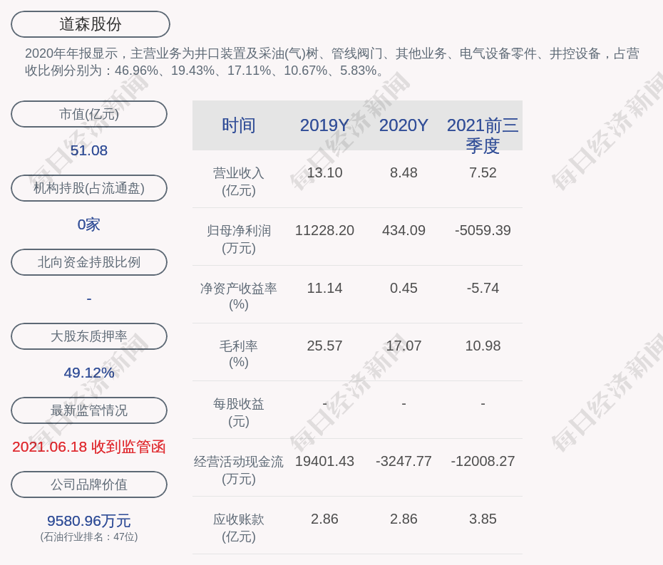 2020年年报显示,道森股份的主营业务为井口装置及采油(气)树、管线阀门、其他业务、电气设备零件、井控设备,占营收比例分别为:46.96%、19.43%、17.11%、10.67%、5.83%。