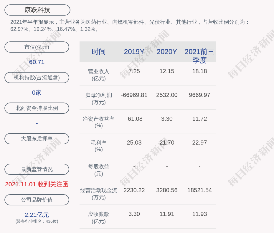 2021年半年报显示,康跃科技的主营业务为医药行业、内燃机零部件、光伏行业、其他行业,占营收比例分别为:62.97%、19.24%、16.47%、1.32%。