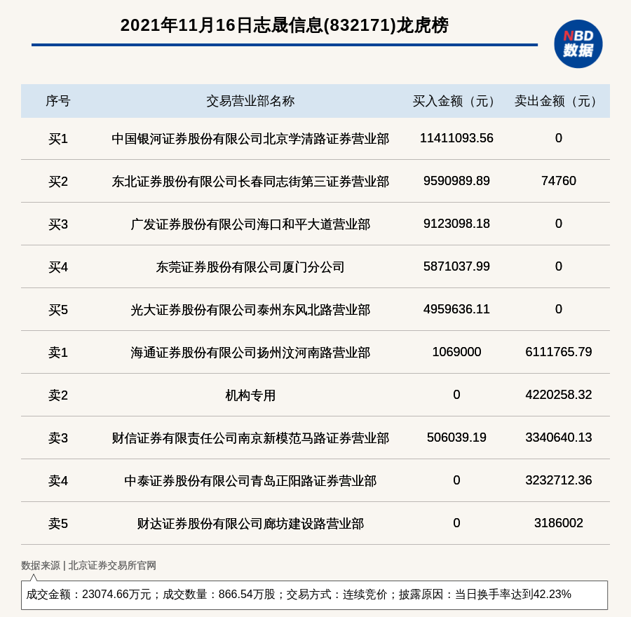 每经讯,2021年11月16日,志晟信息(832171)登上龙虎榜,交易方式是连续竞价,披露原因是当日换手率达到42.23%,成交数量866.54万股,成交金额23074.66万元。买一席位为中国银河证券股份有限公司北京学清路证券营业部,买入1141.11万元;卖一席位为海通证券股份有限公司扬州汶河南路营业部,卖出611.18万元。