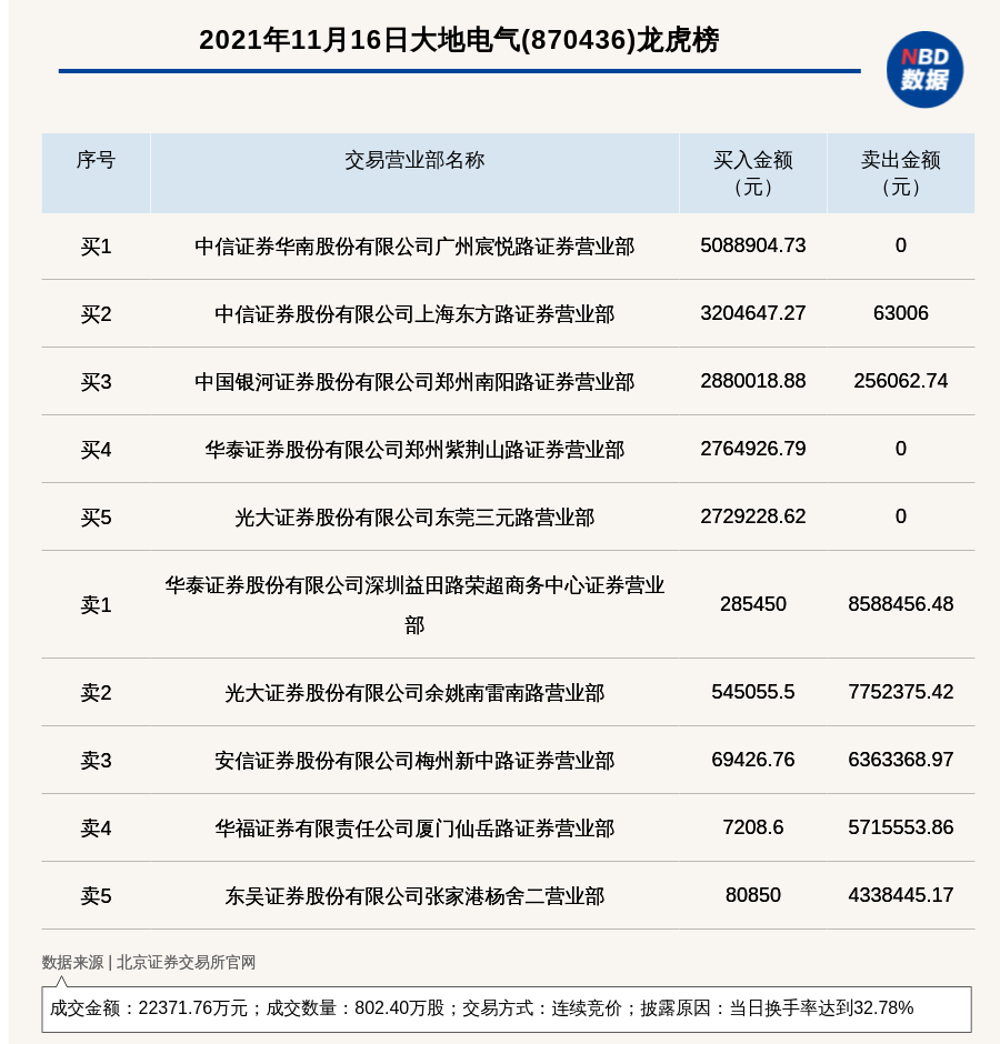 每经讯,2021年11月16日,大地电气(870436)登上龙虎榜,交易方式是连续竞价,披露原因是当日换手率达到32.78%,成交数量802.40万股,成交金额22371.76万元。买一席位为中信证券华南股份有限公司广州宸悦路证券营业部,买入508.89万元;卖一席位为华泰证券股份有限公司深圳益田路荣超商务中心证券营业部,卖出858.85万元。