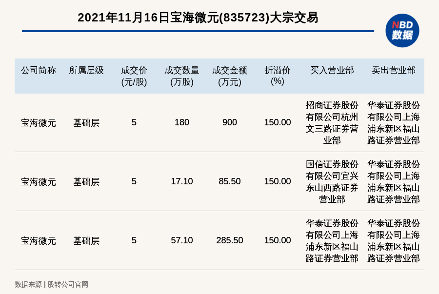 每经讯,2021年11月16日,新三板基础层公司宝海微元(835723)发生3笔大宗交易,溢价率最高的一笔成交价5元/股,成交数量180万股,成交金额900万元,溢价150%。买入营业部是招商证券股份有限公司杭州文三路证券营业部,卖出营业部是华泰证券股份有限公司上海浦东新区福山路证券营业部。