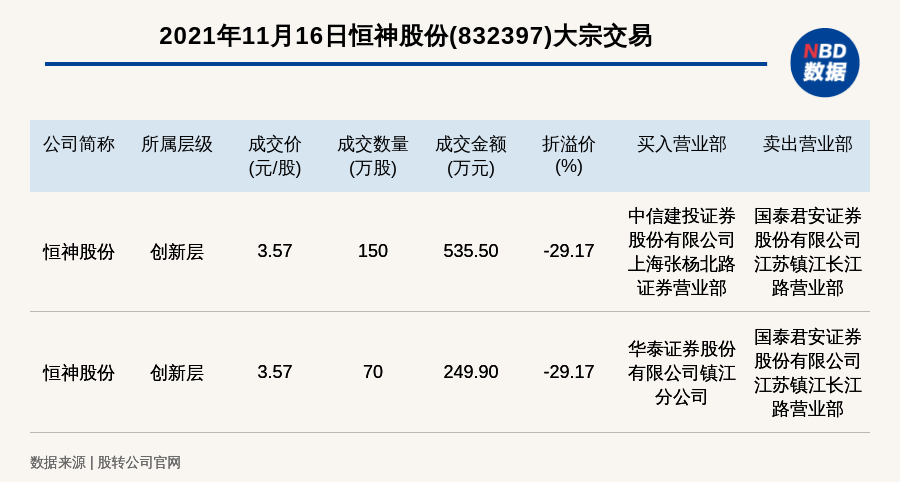 每经讯,2021年11月16日,新三板创新层公司恒神股份(832397)发生2笔大宗交易,折价率最高的一笔成交价3.57元/股,成交数量150万股,成交金额535.50万元,折价29.17%。买入营业部是中信建投证券股份有限公司上海张杨北路证券营业部,卖出营业部是国泰君安证券股份有限公司江苏镇江长江路营业部。