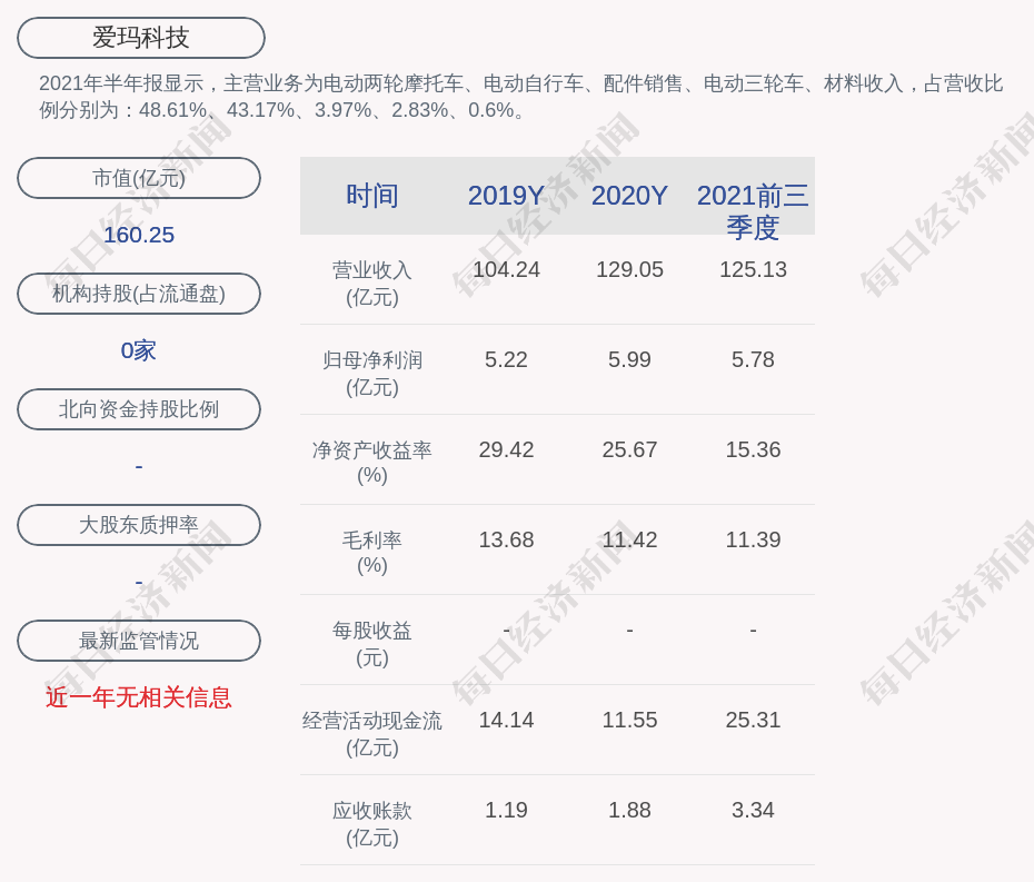2021年半年报显示,爱玛科技的主营业务为电动两轮摩托车、电动自行车、配件销售、电动三轮车、材料收入,占营收比例分别为:48.61%、43.17%、3.97%、2.83%、0.6%。