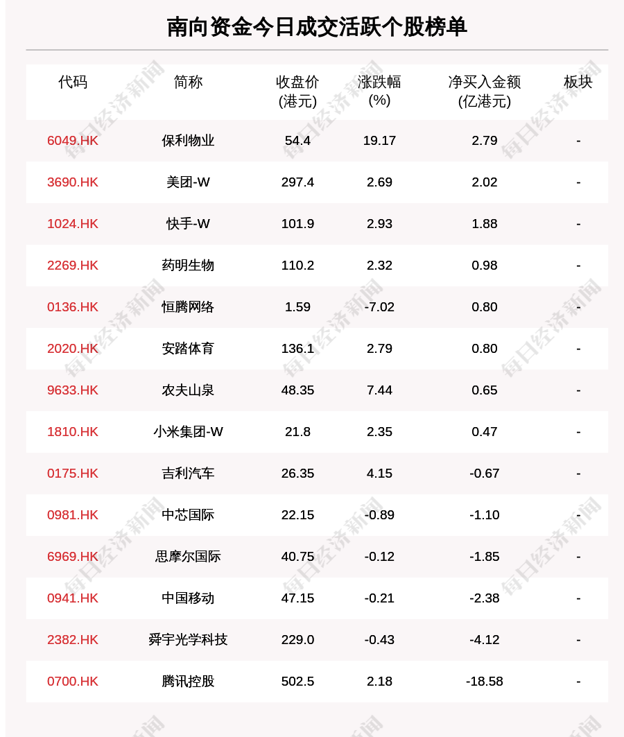 南向资金成交活跃个股榜单中,净买入个股共8只,金额最多的是保利物业(6049.HK,收盘价:54.4港元),净买入2.795亿港元;净卖出个股共6只,金额最多的是腾讯控股(0700.HK,收盘价:502.5港元),净卖出18.579亿港元。