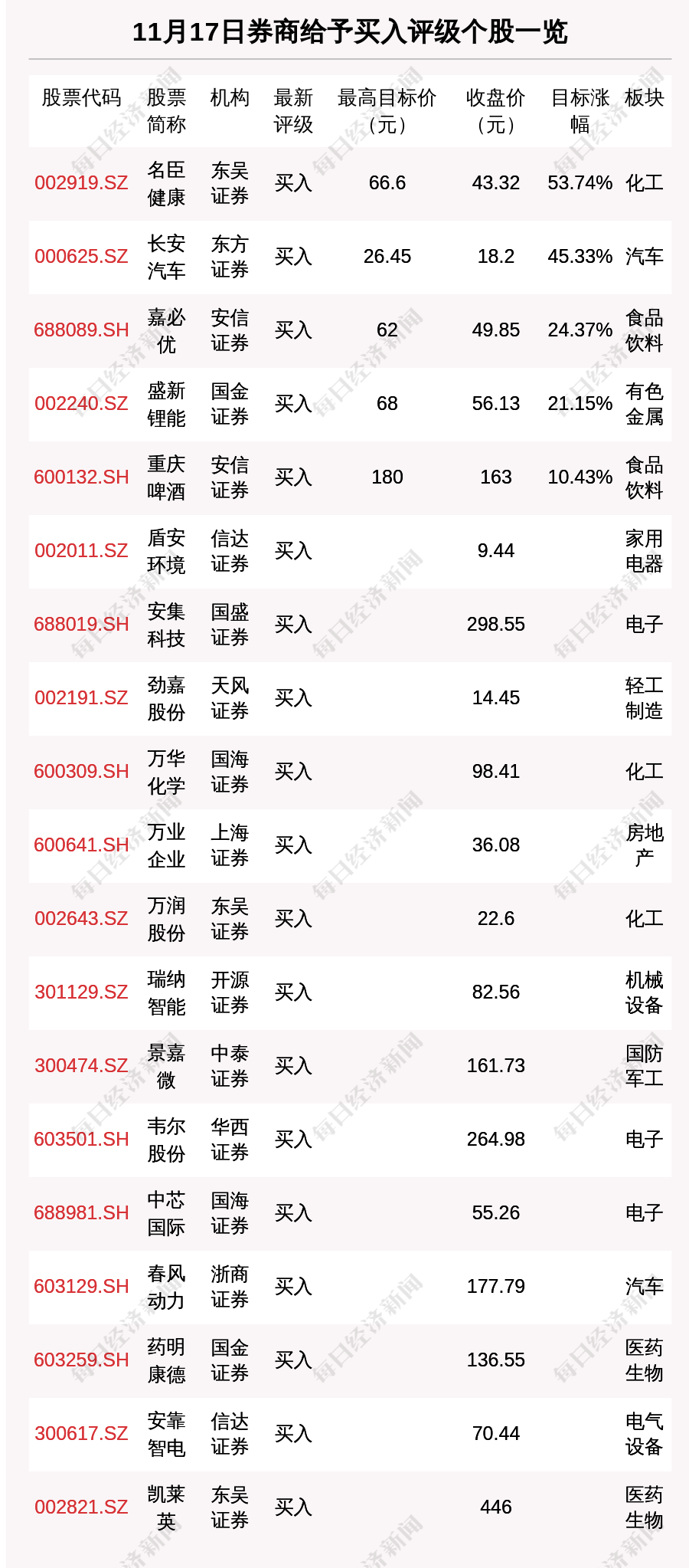 每经AI快讯,11月17日,券商给予评级的个股数共有30只,获得买入评级的个股数共有19只。在公布了目标价格的5只个股中,按照最新收盘价计算,预期涨幅排名居前的个股是名臣健康(002919.SZ)、长安汽车(000625.SZ)、嘉必优(688089.SH),预期涨幅分别是53.74%、45.33%、24.37%。