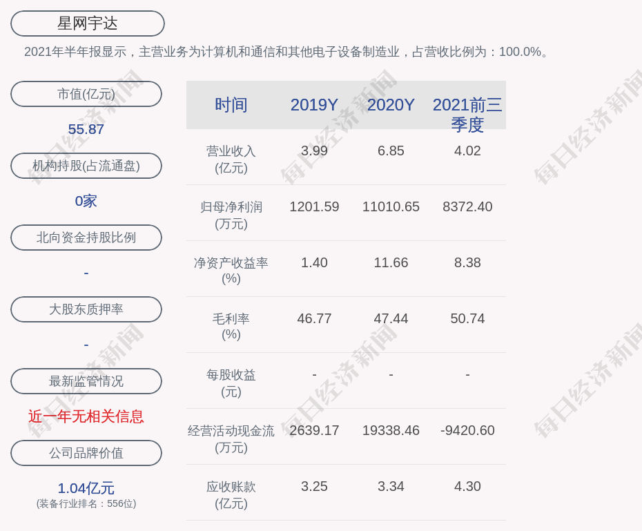 2021年半年报显示,星网宇达的主营业务为计算机和通信和其他电子设备制造业,占营收比例为:100.0%。