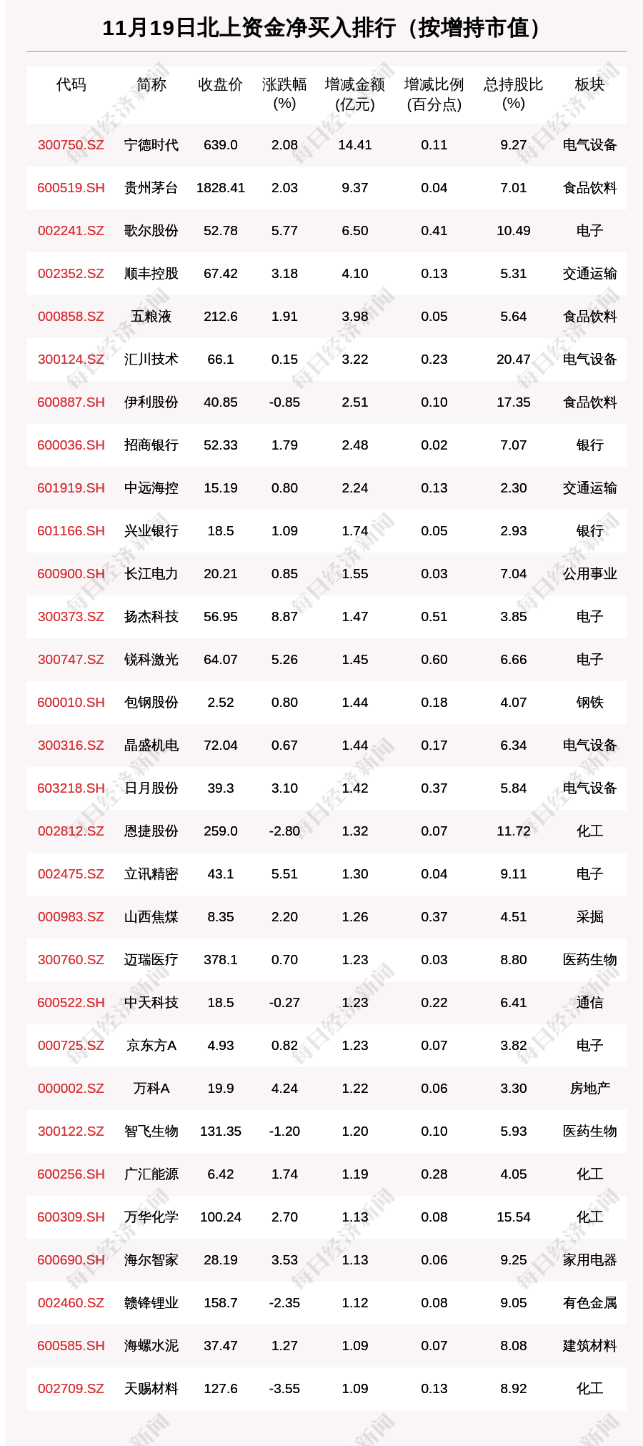 11月19日,按照北向资金增持市值排序,宁德时代(300750.SZ,收盘价:639.0元)增持市值最大,增持市值14.411亿元,环比增加1.23%。其他北上资金增持市值较多的个股还包括贵州茅台(600519.SH,收盘价:1828.41元)、歌尔股份(002241.SZ,收盘价:52.78元)、顺丰控股(002352.SZ,收盘价:67.42元)。