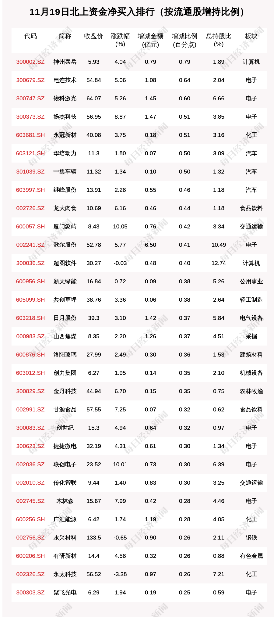 每经AI快讯,11月19日,北上资金净买入的个股共有775只,北上资金加仓比例超1%的有624只。其中,神州泰岳(300002.SZ,收盘价:5.93元)加仓比例最为明显,最新持股比例1.89%,环比增加0.79个百分点。其他北上资金加仓比例较多的个股还包括电连技术(300679.SZ,收盘价:54.84元)、锐科激光(300747.SZ,收盘价:64.07元)、扬杰科技(300373.SZ,收盘价:56.95元)。