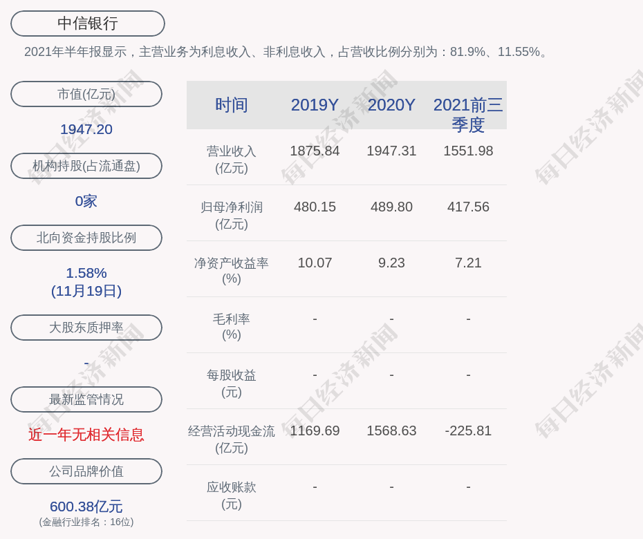 2021年半年报显示,中信银行的主营业务为利息收入、非利息收入,占营收比例分别为:81.9%、11.55%。