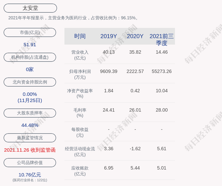 2021年半年报显示,太安堂的主营业务为医药行业,占营收比例为:96.15%。