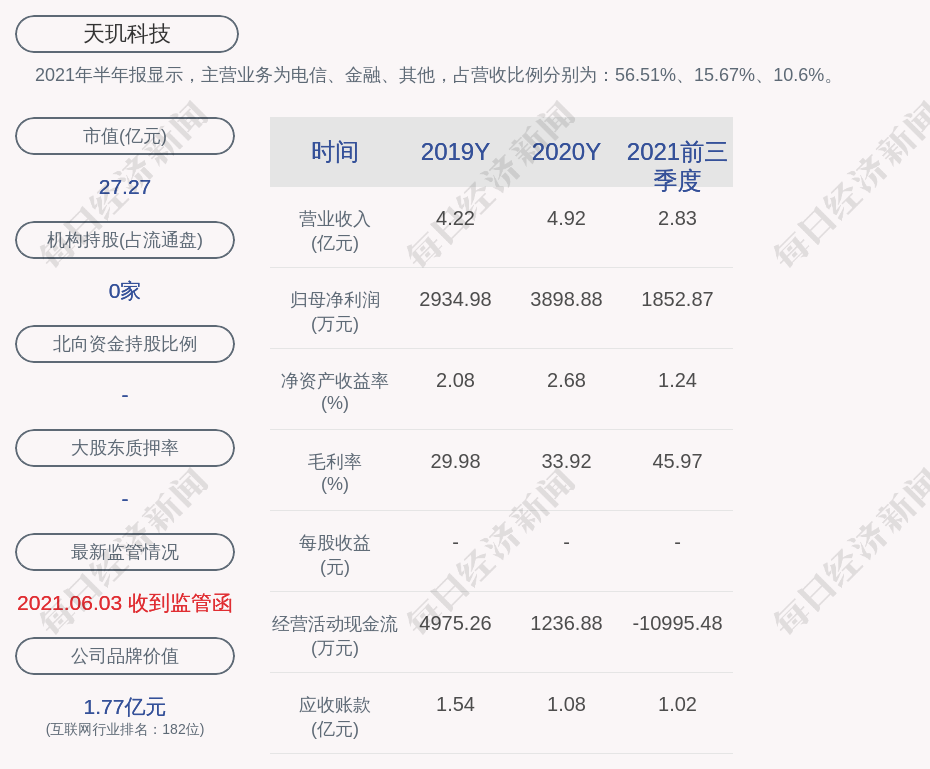 2021年半年报显示,天玑科技的主营业务为电信、金融、其他,占营收比例分别为:56.51%、15.67%、10.6%。
