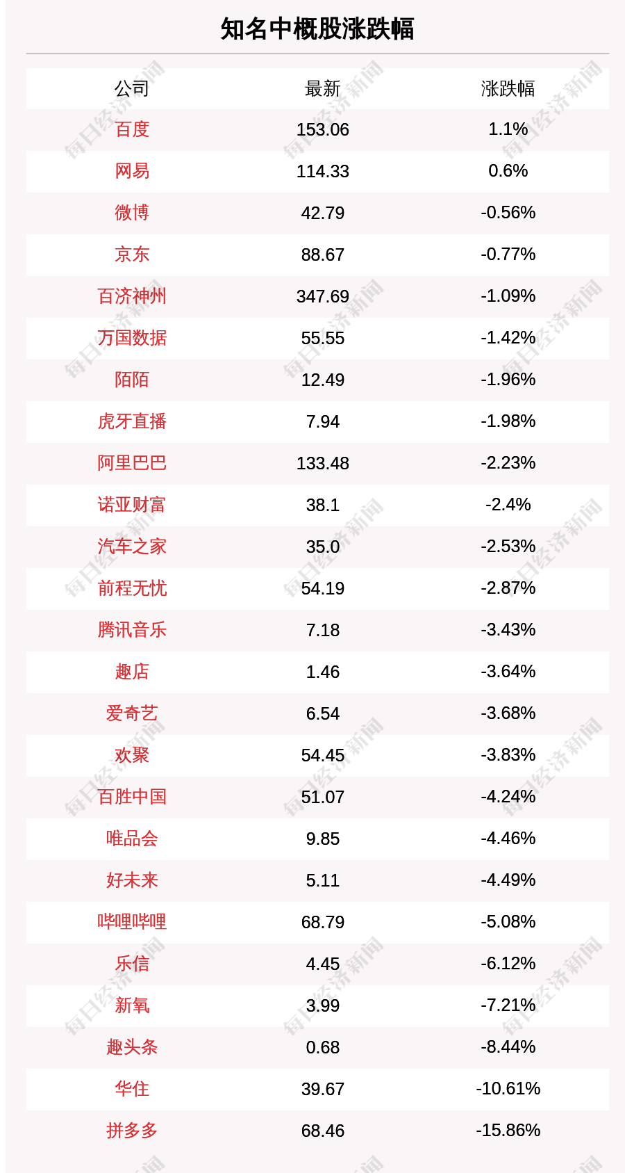 每经AI快讯:北京时间11月27日05:00,知名中概股中百度、网易涨幅居前,收盘分别上涨1.1%、0.6%。拼多多、华住、趣头条、新氧、乐信跌幅居前,收盘分别下跌15.86%、10.61%、8.44%、7.21%、6.12%。