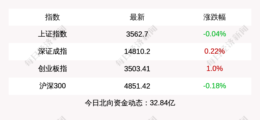 每经AI快讯:北京时间11月29日15:00,上证指数收盘下跌1.39点,跌幅为0.04%,报收3562.7点,成交额4900.38亿元;深证成指收盘上涨33.03点,涨幅为0.22%,报收14810.2点,成交额6875.3亿元;创业板指收盘上涨34.54点,涨幅为1.0%,报收3503.41点,成交额3119.11亿元;沪深300收盘下跌8.71点,跌幅为0.18%,报收4851.42点,成交额2859.95亿元。北上资金当日净流入32.84亿元。