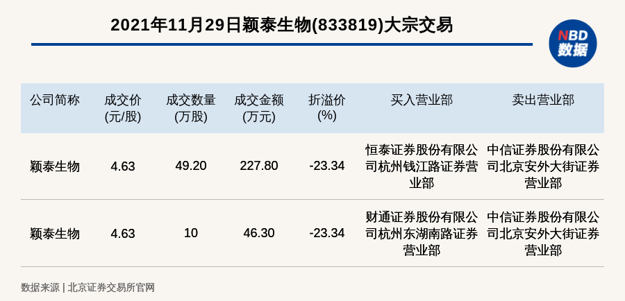 每经讯,2021年11月29日,北交所上市公司颖泰生物(833819)发生2笔大宗交易,折价率最高的一笔成交价4.63元/股,成交数量49.20万股,成交金额227.80万元,折价23.34%。买入营业部是恒泰证券股份有限公司杭州钱江路证券营业部,卖出营业部是中信证券股份有限公司北京安外大街证券营业部。