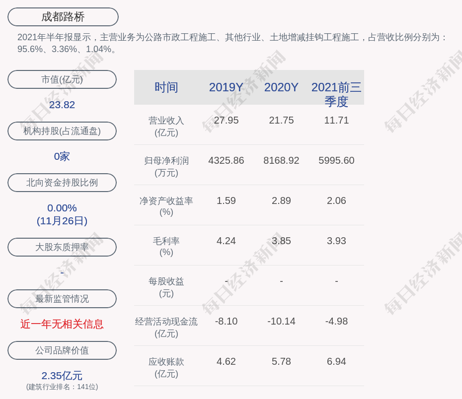 2021年半年报显示,成都路桥的主营业务为公路市政工程施工、其他行业、土地增减挂钩工程施工,占营收比例分别为:95.6%、3.36%、1.04%。