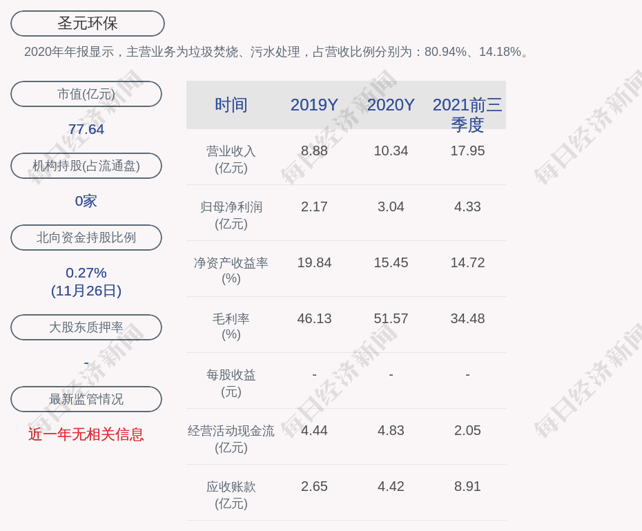2020年年报显示,圣元环保的主营业务为垃圾焚烧、污水处理,占营收比例分别为:80.94%、14.18%。