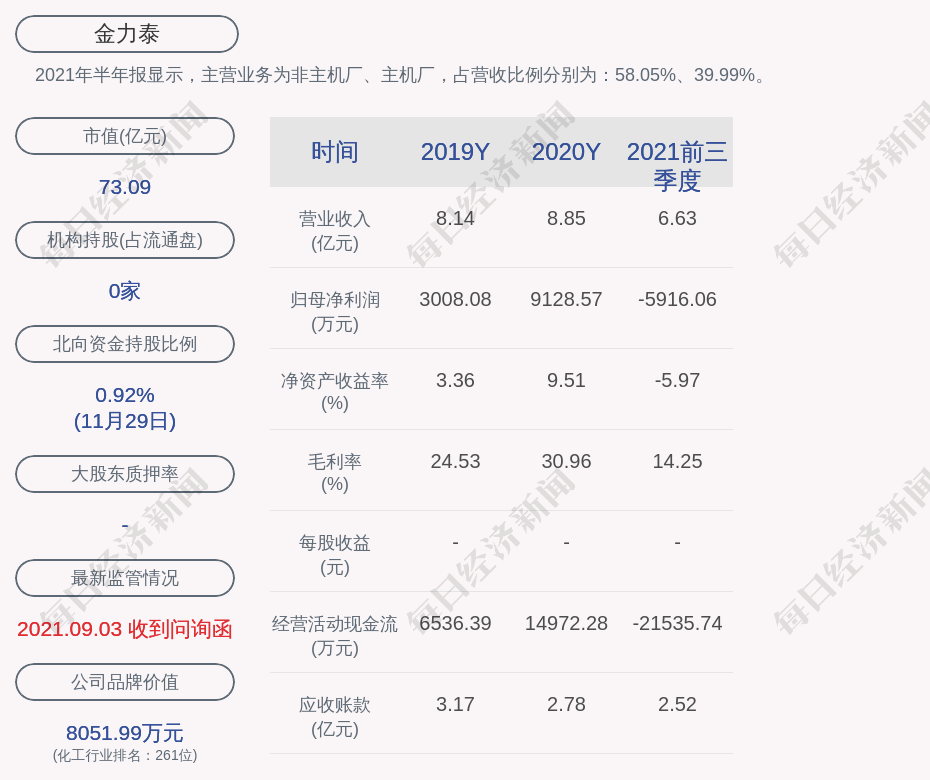 2021年半年报显示,金力泰的主营业务为非主机厂、主机厂,占营收比例分别为:58.05%、39.99%。