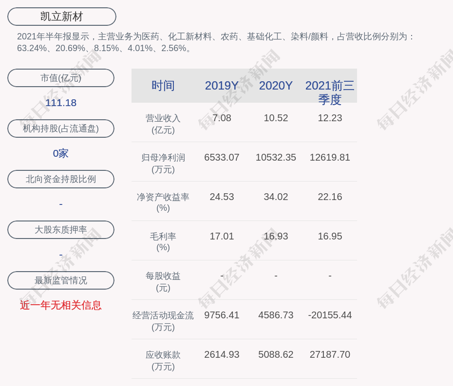 2021年半年报显示,凯立新材的主营业务为医药、化工新材料、农药、基础化工、染料/颜料,占营收比例分别为:63.24%、20.69%、8.15%、4.01%、2.56%。