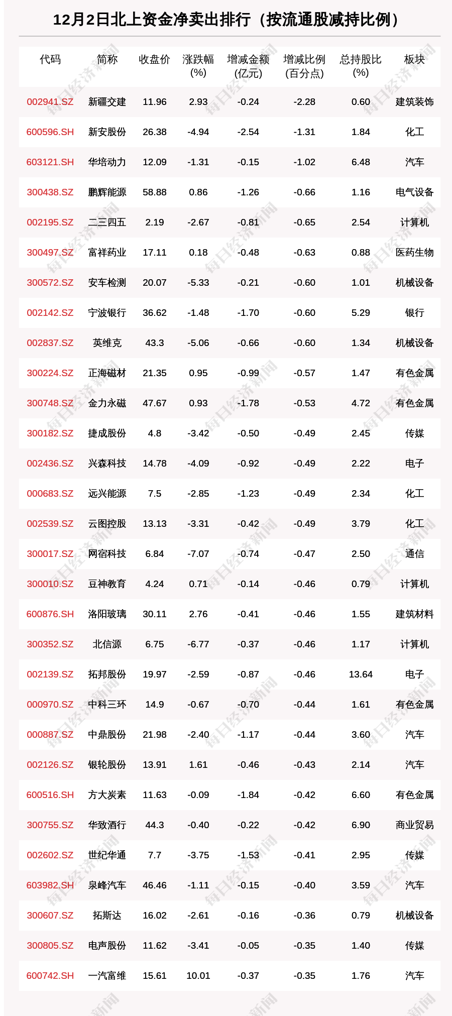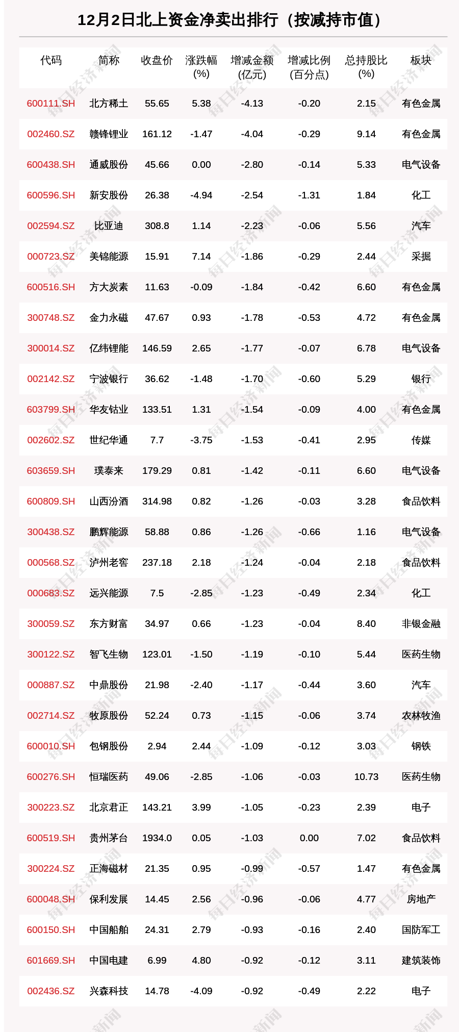 12月2日,按照北向资金减持市值排序,北方稀土(600111.SH,收盘价:55.65元)减持市值最大,减持市值4.125亿元,环比减少9.12%。其他北上资金减持市值较多的个股还包括赣锋锂业(002460.SZ,收盘价:161.12元)、通威股份(600438.SH,收盘价:45.66元)、新安股份(600596.SH,收盘价:26.38元)。