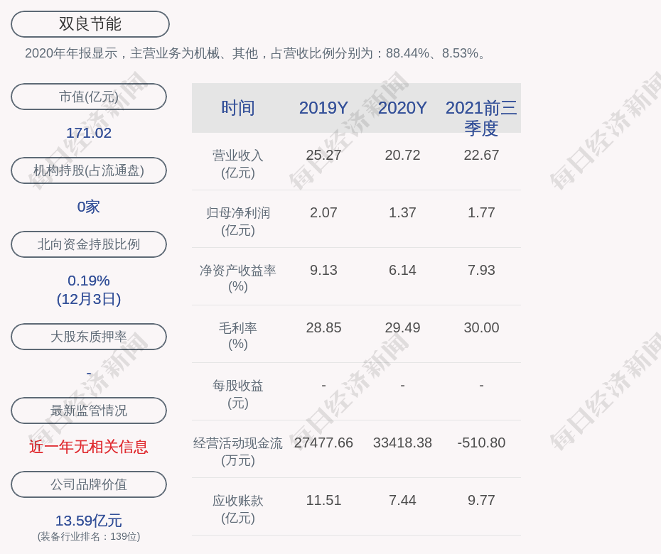 2020年年报显示,双良节能的主营业务为机械、其他,占营收比例分别为:88.44%、8.53%。