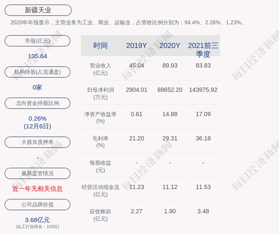 2020年年报显示,新疆天业的主营业务为工业、商业、运输业,占营收比例分别为:94.4%、2.26%、1.23%。