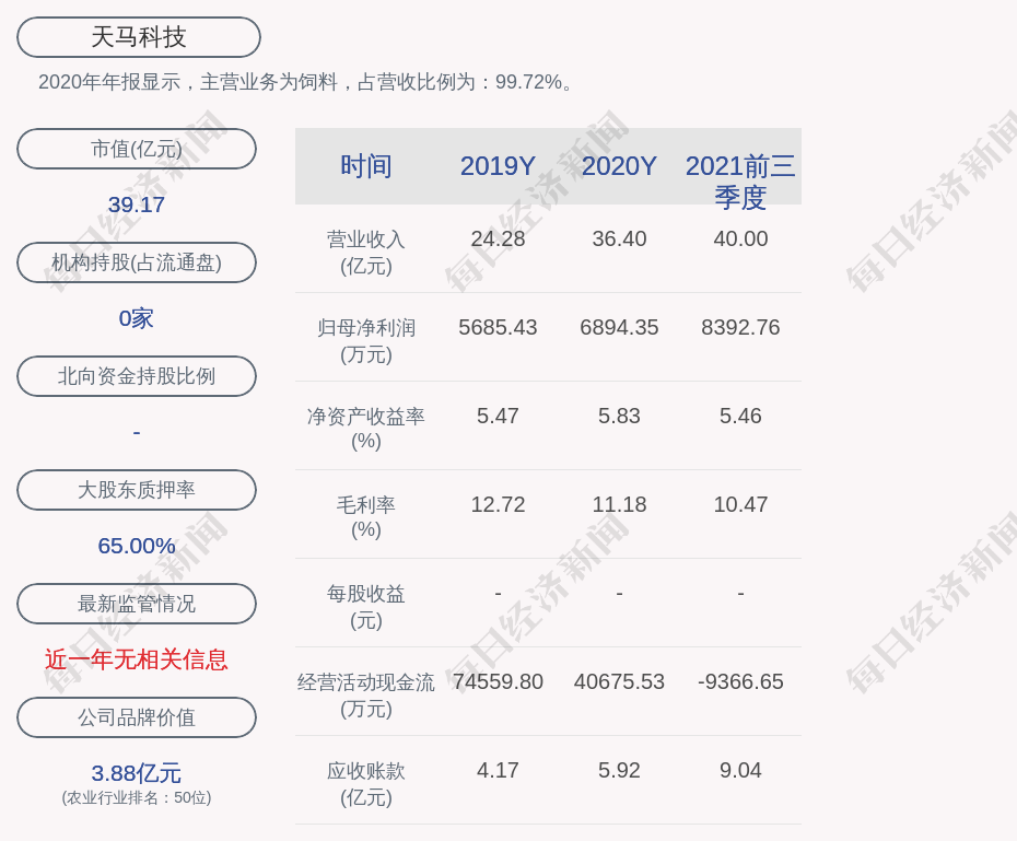 2020年年报显示,天马科技的主营业务为饲料,占营收比例为:99.72%。