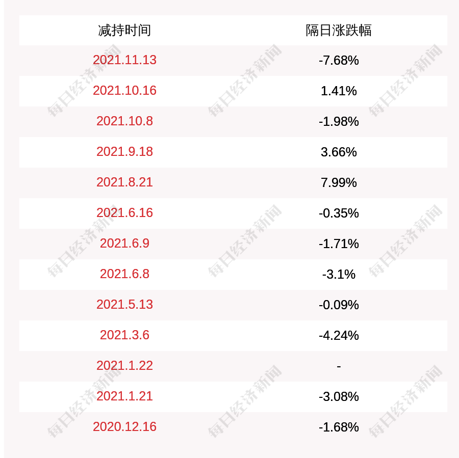 3. 万盛股份上次发布减持公告是2021年11月13日,第二个交易日下跌7.68%,万盛股份近一年共发布14次减持类公告。