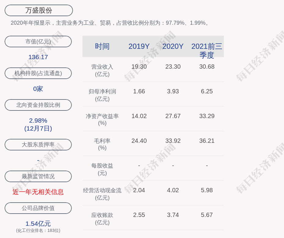 2020年年报显示,万盛股份的主营业务为工业、贸易,占营收比例分别为:97.79%、1.99%。
