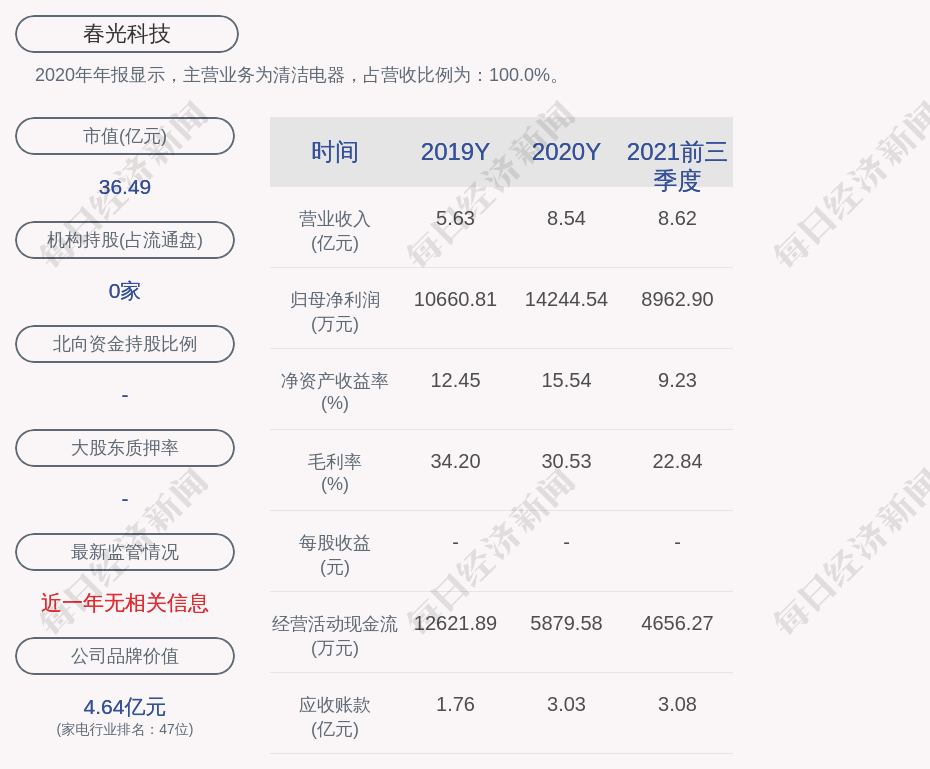 2020年年报显示,春光科技的主营业务为清洁电器,占营收比例为:100.0%。