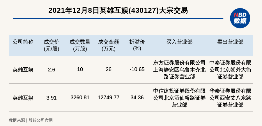 每经讯,2021年12月8日,新三板创新层公司英雄互娱(430127)发生2笔大宗交易,溢价率最高的一笔成交价3.91元/股,成交数量3260.81万股,成交金额12749.77万元,溢价34.36%。买入营业部是中信建投证券股份有限公司北京酒仙桥路证券营业部,卖出营业部是华泰证券股份有限公司西安丈八东路证券营业部。