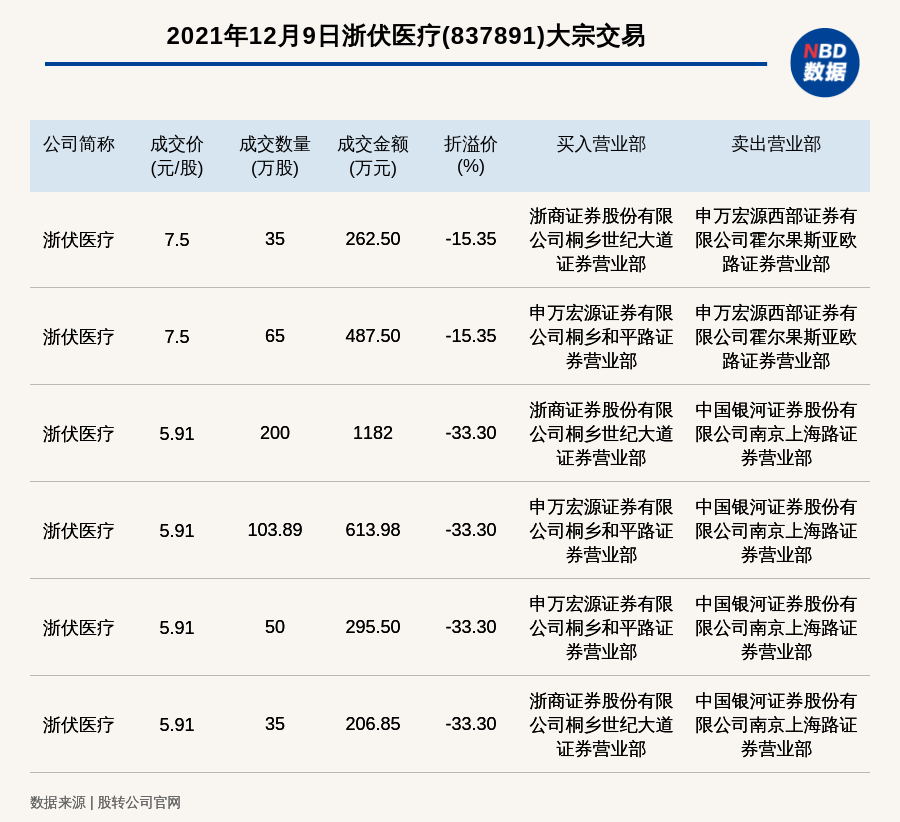 每经讯,2021年12月9日,新三板创新层公司浙伏医疗(837891)发生6笔大宗交易,折价率最高的一笔成交价5.91元/股,成交数量200万股,成交金额1182万元,折价33.3%。买入营业部是浙商证券股份有限公司桐乡世纪大道证券营业部,卖出营业部是中国银河证券股份有限公司南京上海路证券营业部。