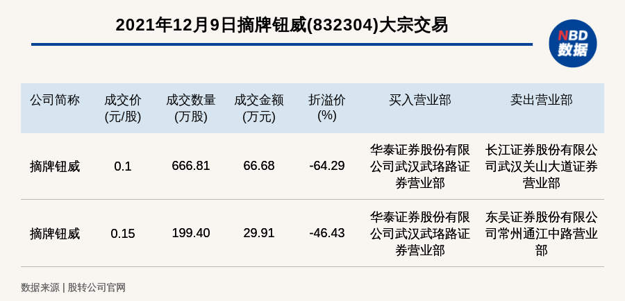 每经讯,2021年12月9日,新三板基础层公司摘牌钮威(832304)发生2笔大宗交易,折价率最高的一笔成交价0.1元/股,成交数量666.81万股,成交金额66.68万元,折价64.29%。买入营业部是华泰证券股份有限公司武汉武珞路证券营业部,卖出营业部是长江证券股份有限公司武汉关山大道证券营业部。
