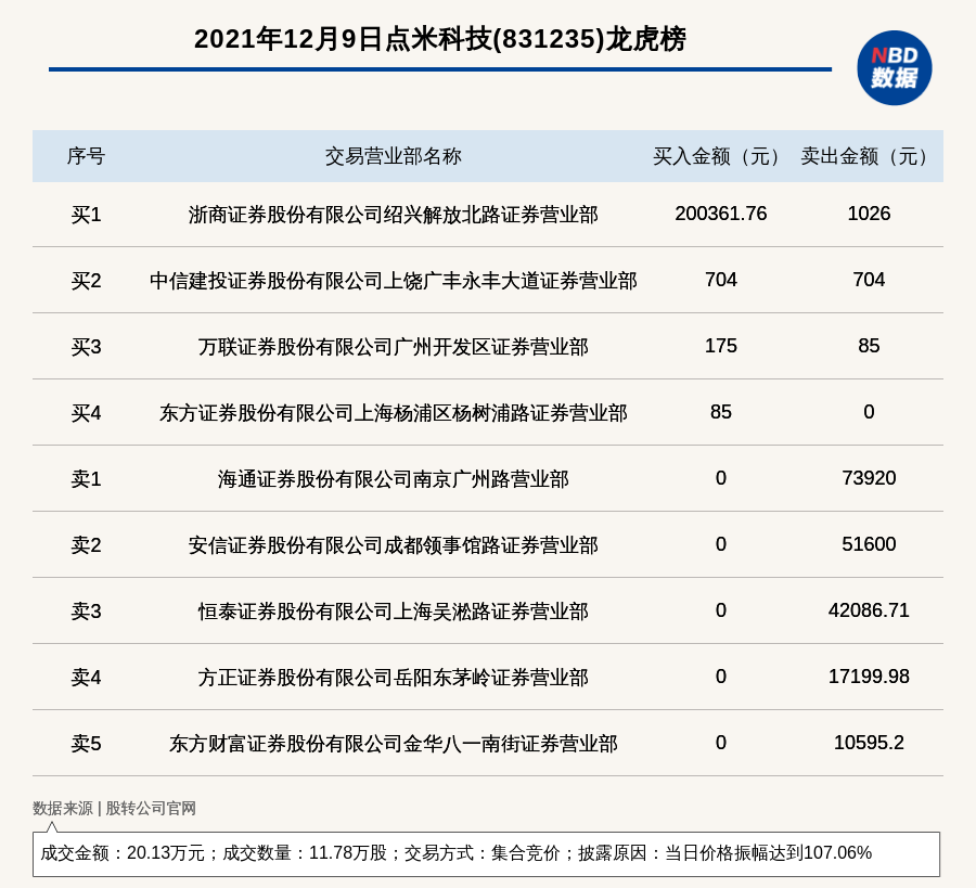 每经讯,2021年12月9日,新三板创新层公司点米科技(831235)登上龙虎榜,交易方式是集合竞价,披露原因是当日价格振幅达到107.06%,成交数量11.78万股,成交金额20.13万元。买一席位为浙商证券股份有限公司绍兴解放北路证券营业部,买入20.04万元;卖一席位为海通证券股份有限公司南京广州路营业部,卖出7.39万元。