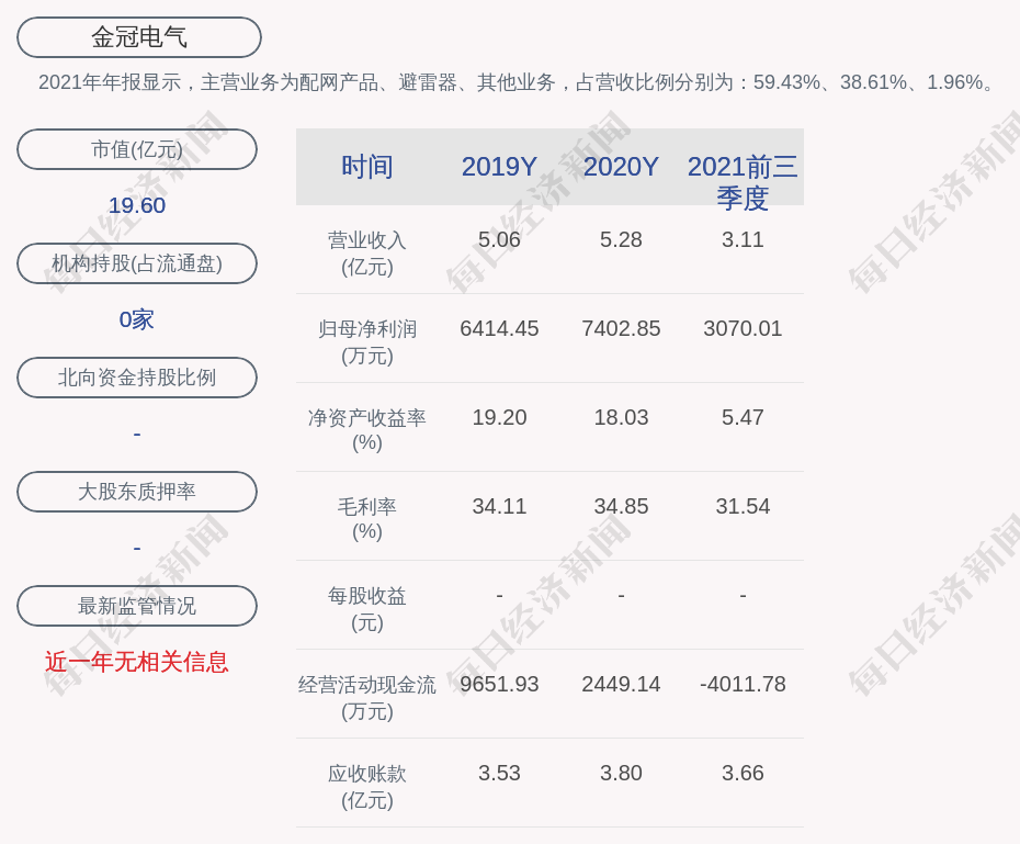 2021年年报显示,金冠电气的主营业务为配网产品、避雷器、其他业务,占营收比例分别为:59.43%、38.61%、1.96%。