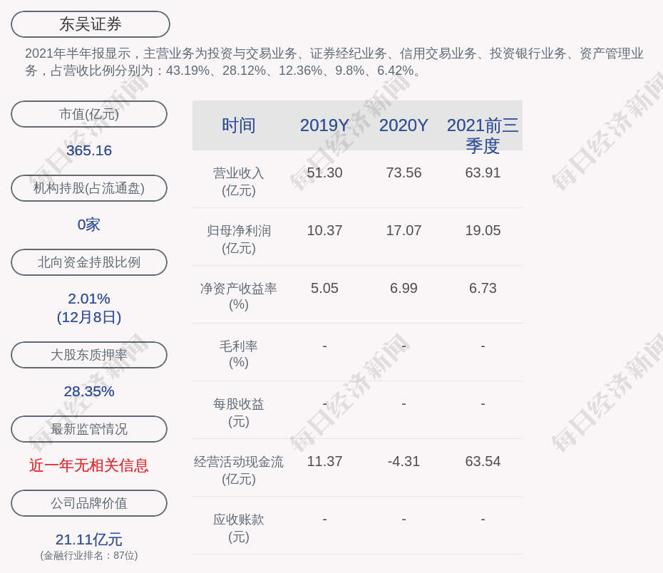2021年半年报显示,东吴证券的主营业务为投资与交易业务、证券经纪业务、信用交易业务、投资银行业务、资产管理业务,占营收比例分别为:43.19%、28.12%、12.36%、9.8%、6.42%。